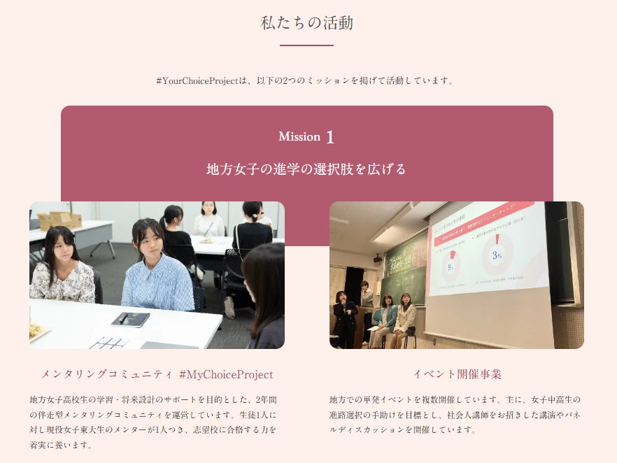 「全ての学生が、生まれついた地域や生まれ持ったジェンダーに関わらず自由な進学選択・キャリア選択ができる社会」を目指しており、2つのミッションを掲げ活動をしています。