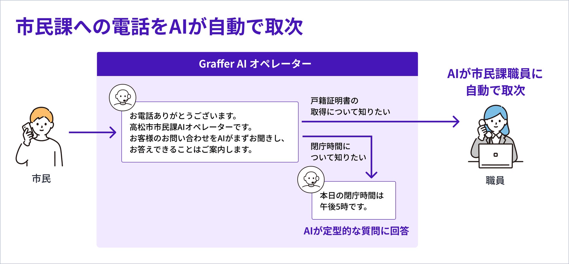 ・「Graffer AI オペレーター」が、市民課の幅広い内容に関する電話での問い合わせに応答します。