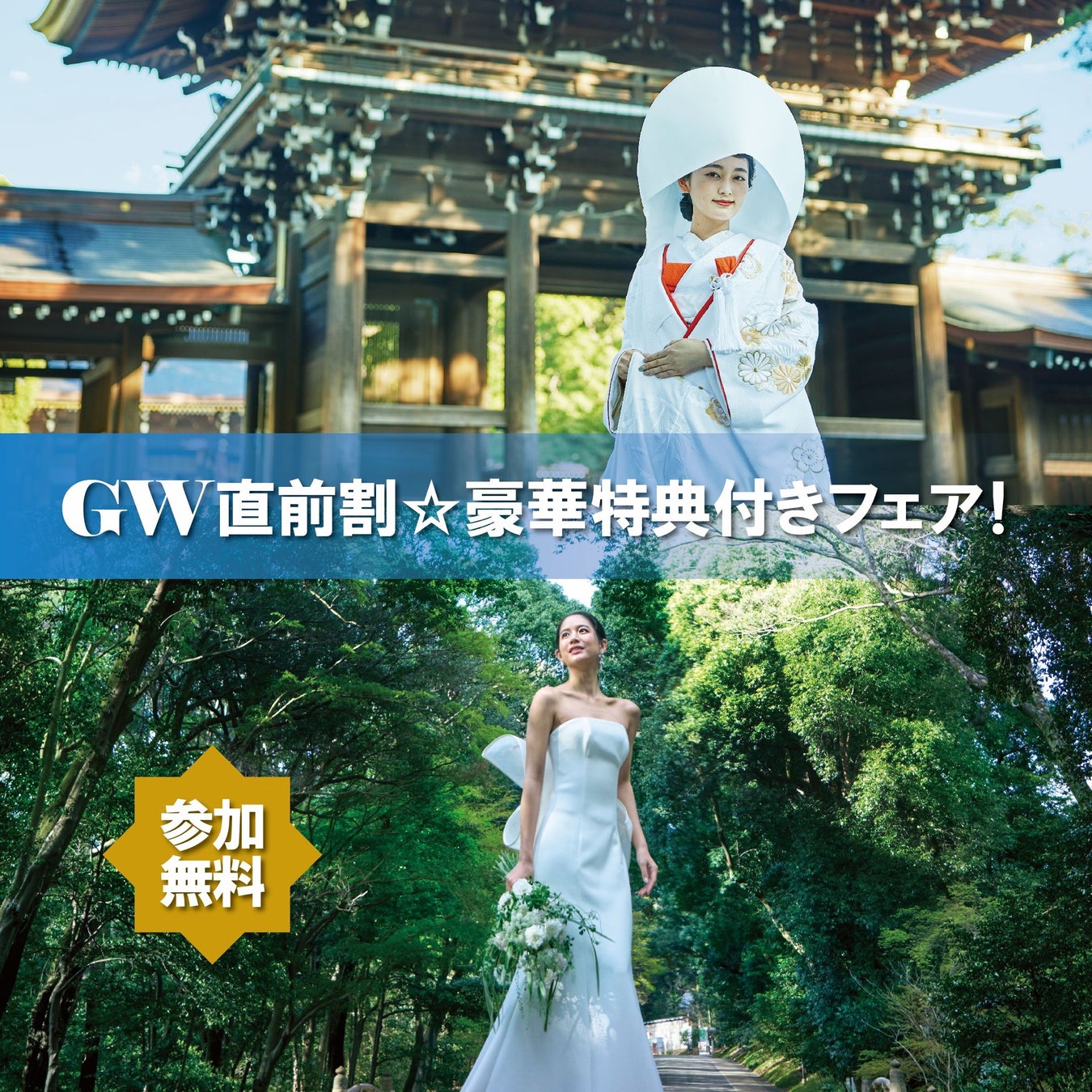 結婚の予定はあるけれど、GWは長期休暇を取ってふたりで旅行に行きたい。旅行には行きたいけれど、結婚の準備は早めに済ませておきたい。そんなカップルにオススメのGW直前割引も付いたお得なブライダルフェアをご用意しました。