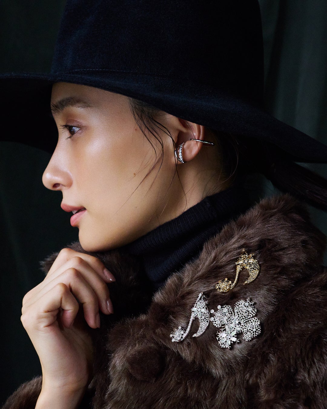 雪の結晶でかたどった音符とフラワーモチーフのブローチは、シーズンムード漂うロマンティックなアイテム。