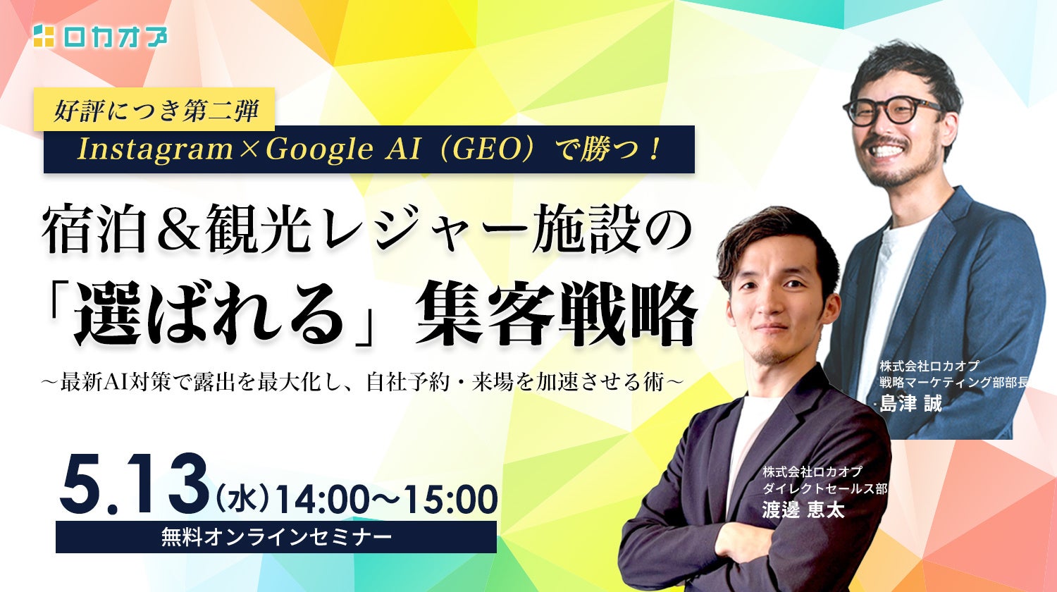 株式会社ロカオプ(本社:大阪府大阪市 代表取締役:縣将貴、以下:ロカオプ)は、5月13日(水)14:00より無料のオンラインセミナー『【好評につき第二弾】Instagram×Google AI(GEO)で勝つ!宿泊&観光レジャー施設の「選ばれる」集客戦略 〜最新AI対策で露出を最大化し、自社予約・来場を加速させる術〜』を開催いたします。