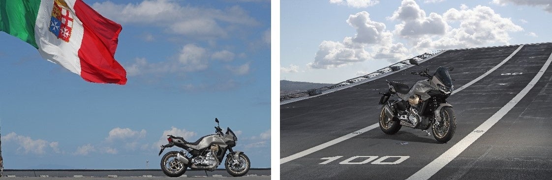 この感動的なエピソードに由来し、2022年9月にはモト・グッツィ V100マンデッロ・アヴィアツィオーネ・ナヴァーレの世界初公開が、空母カヴールの飛行甲板に設けられた豪華なステージで行われ、モト・グッツィとイタリア海軍との100年以上にわたる両者の固い絆を記念した式典を開催しました。