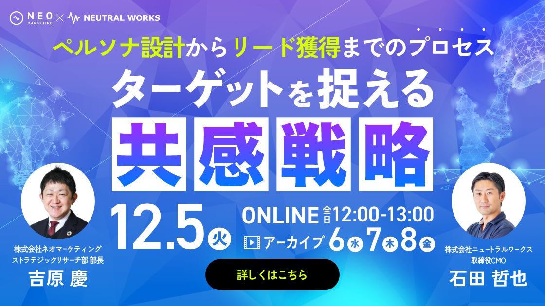 【12/5無料ウェビナー】ターゲットを捉える共感戦略〜ペルソナ設計からリード獲得までのプロセスを徹底解説!〜