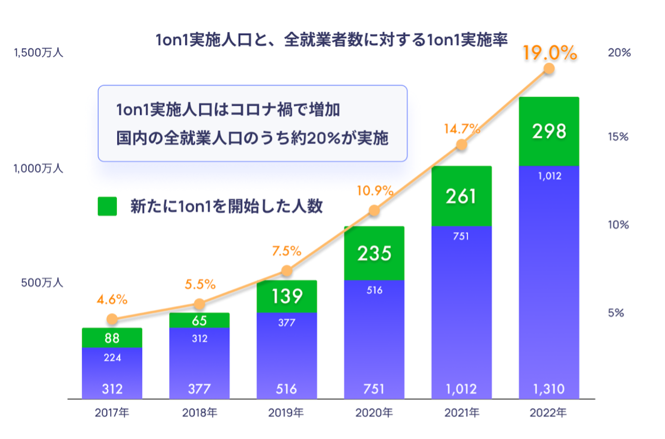 KAKEAIが実施した1on1に関する実態調査によると、新型コロナウイルス流行以前である2019年の1on1実施人口は推計516万人・国内全就業者数の7.5%であったのに対し、働き方が大きく変化した2020年以降に1on1へ取り組みが加速し、2022年7月には、1on1実施人口は推計1,310万人・国内全就業者数の19%に及んでいます。