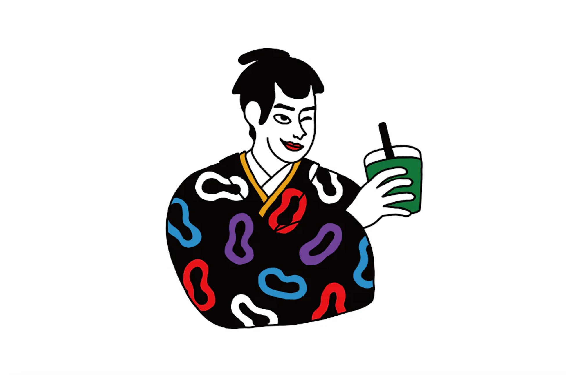 抹茶ラテを持つ男性のイラスト。「抹茶で乾杯!」と思わず笑顔になるひとときを表現しています。