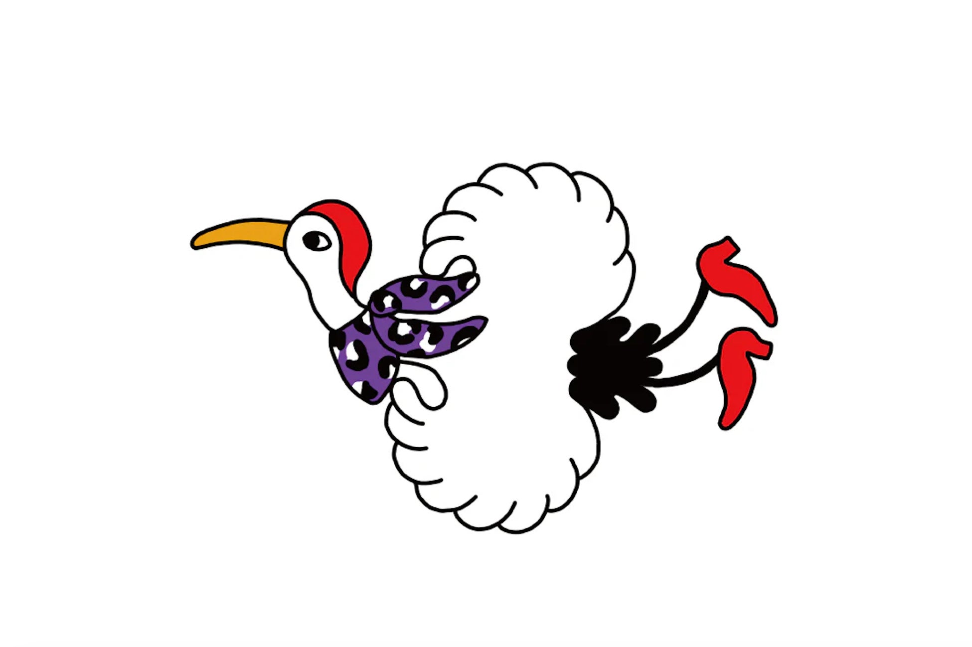 繊細なイメージの鶴に、あえて豹柄のスカーフやハイヒールを合わせたデザインに仕上げています。