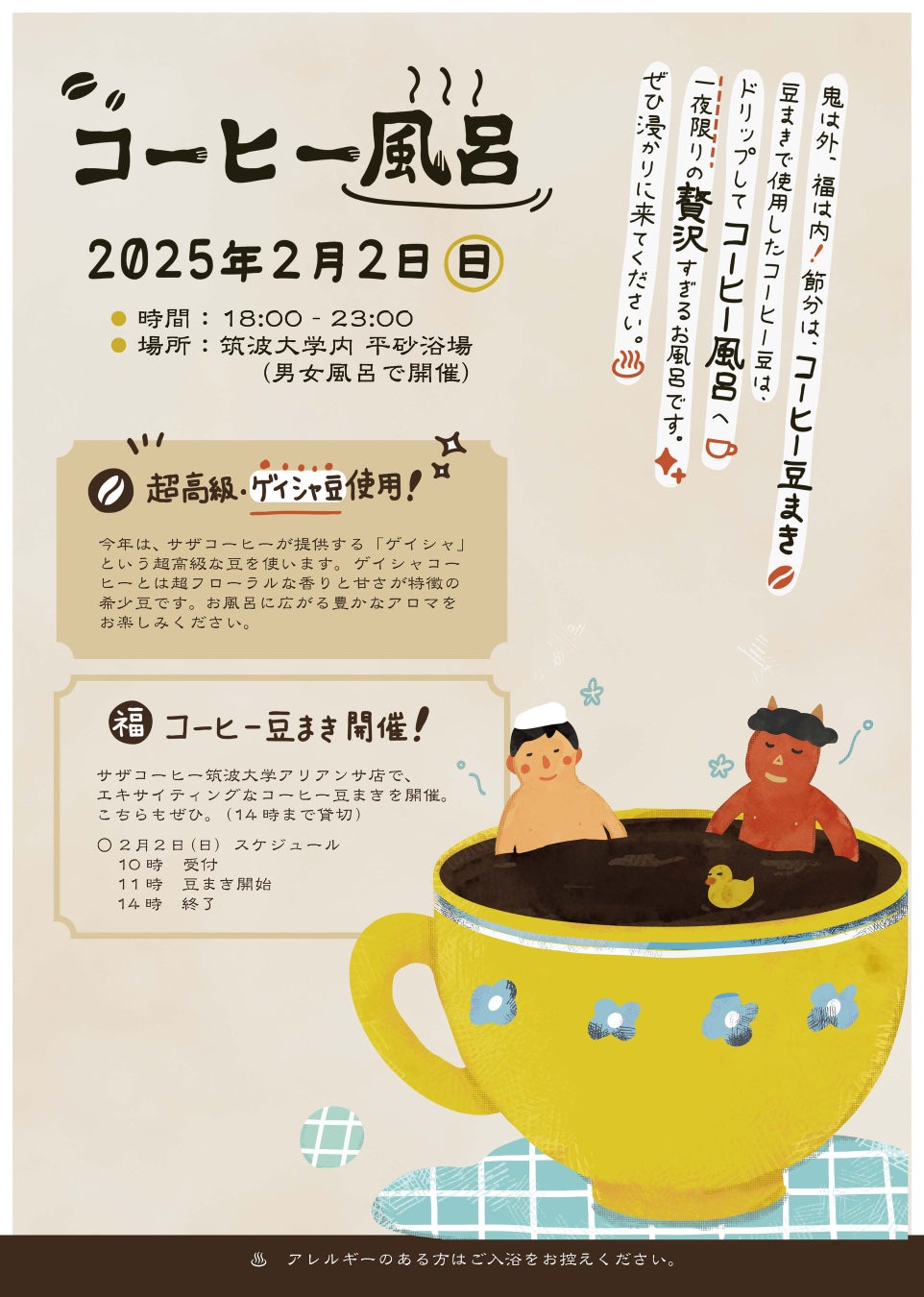 今年はゲイシャコーヒー豆まきで、ゲイシャコーヒーのコーヒー風呂。ゲイシャコーヒーエキサイティング豆まき(赤鬼チームと青鬼チームに分かれて本気の豆まき対決をする。ちょっと痛い。)で厄を払って今年の願い事を宣言する、そして、コーヒー風呂で体を清めて体を温める。焙煎コーヒー豆には約15%のコーヒー油を持っており、ドリップコーヒーはコーヒーの香りとコーヒー液体中のコーヒーとかコーヒーの成分が謎に体を温めて最高に元気になると感じます。鈴木太郎談