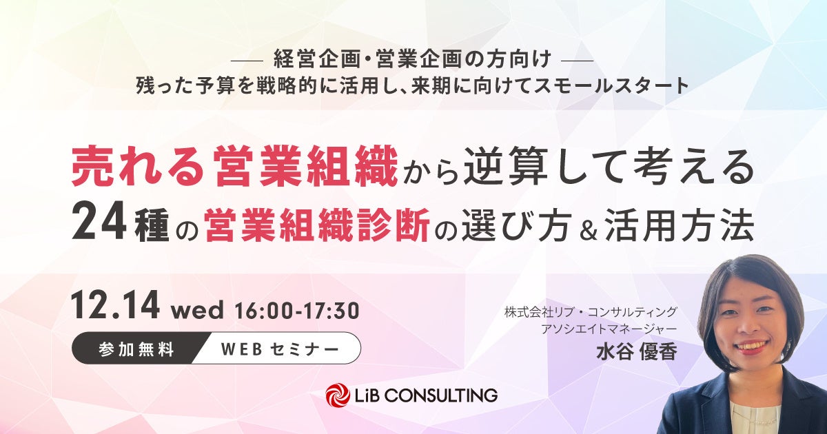 株式会社リブ・コンサルティング(本社:東京都千代田区、代表取締役:関 厳)は、経営企画・営業企画の方向けに、来期に向けて残予算を効果的・戦略的な活用法を伝授するオンラインセミナーを2022年12月14日(水)に開催いたします。