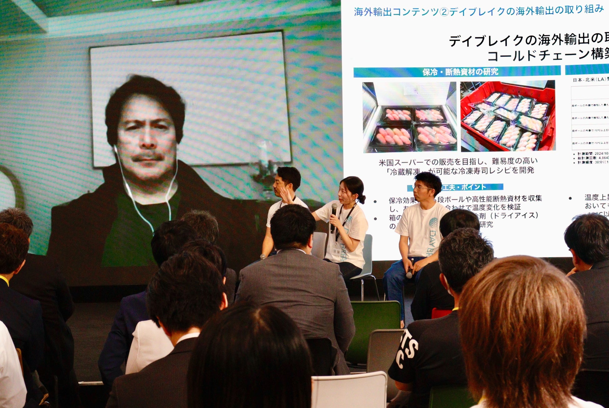 後半は、デイブレイクが手掛ける冷凍寿司の海外輸出プロジェクトの最新動向を紹介。冷凍技術とレシピ開発、コールドチェーンの研究によって、品質を保持しながら長距離輸送を可能にした実績、ノウハウを共有しました。さらに、アメリカの日系大手スーパーマーケット「ミツワマーケットプレイス」でデイブレイクの冷凍寿司が発売決定したこと(※)を発表し、大きな反響を呼びました。
