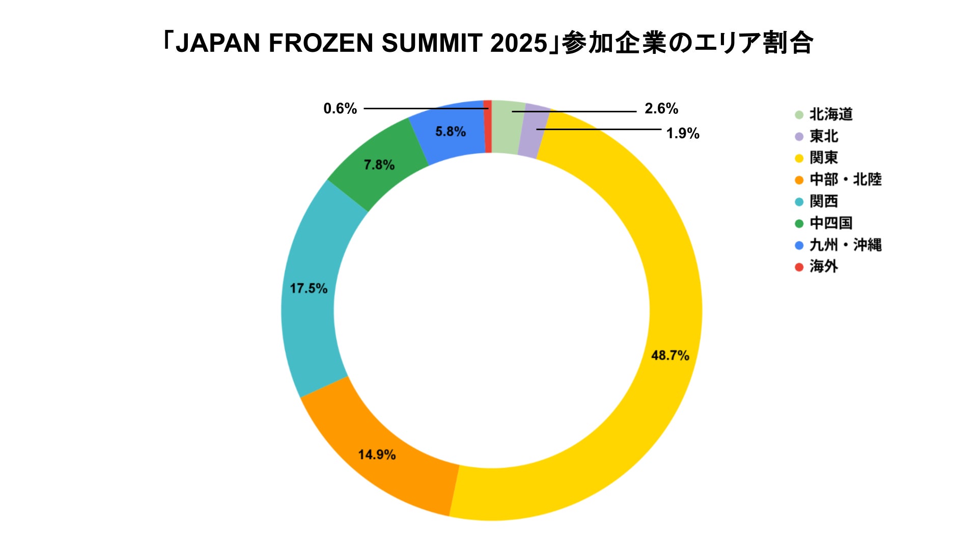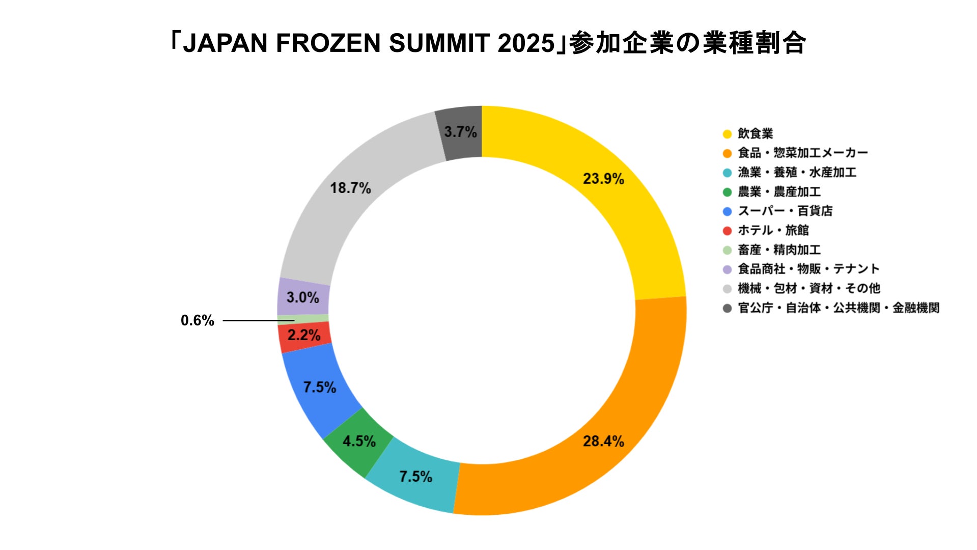 「JAPAN FROZEN SUMMIT 2025」には、全国から約150社・250名が集まりました。参加企業の業種は多岐にわたり、食品加工業が28%、飲食業が24%を占めたほか、スーパー・百貨店(7.5%)、ホテル・旅館(2.2%)などの業界関係者も参加。地域も北海道から九州までと全国各地からの参加があり、冷凍技術に対する関心の高さと期待がうかがえるイベントとなりました。
