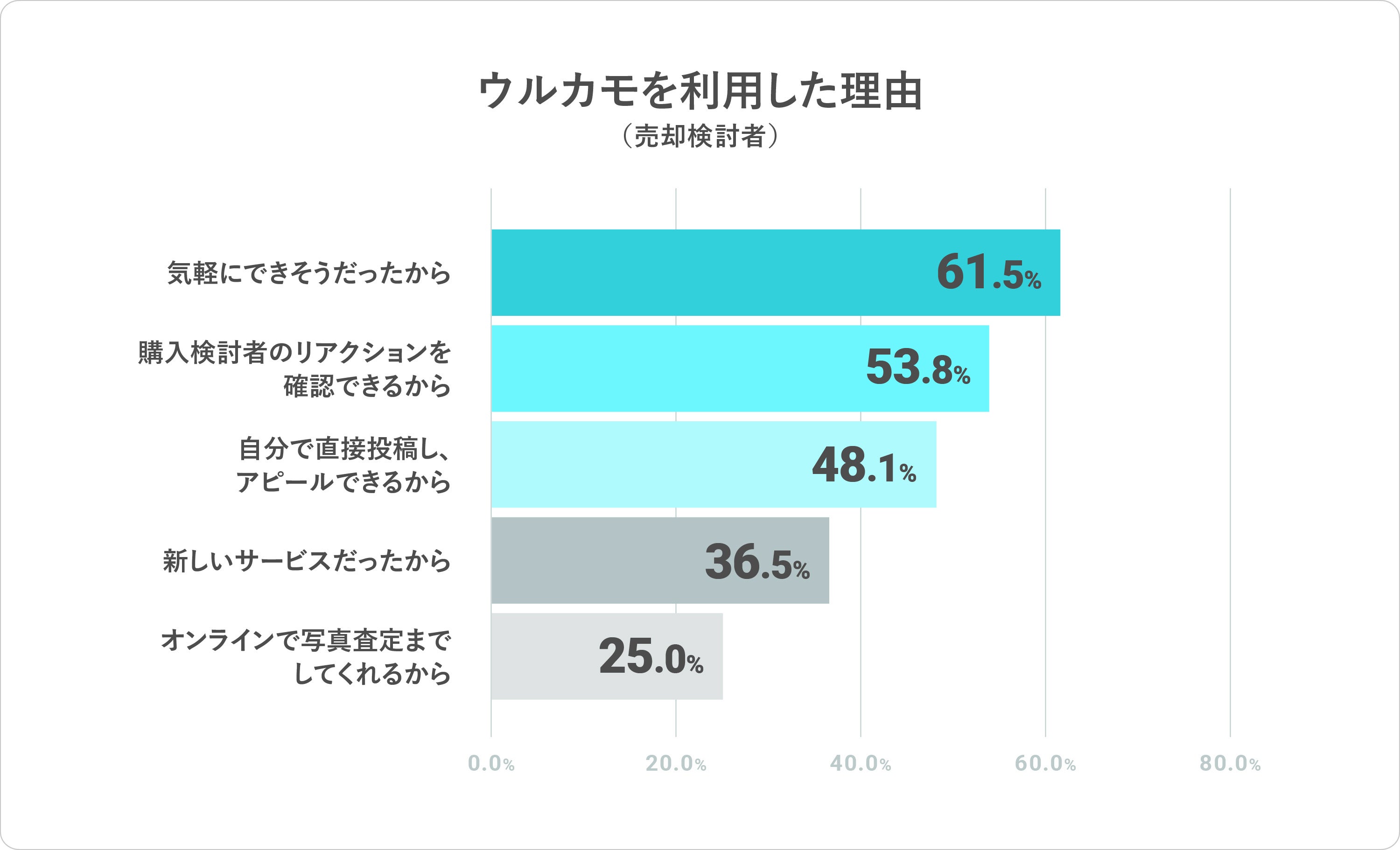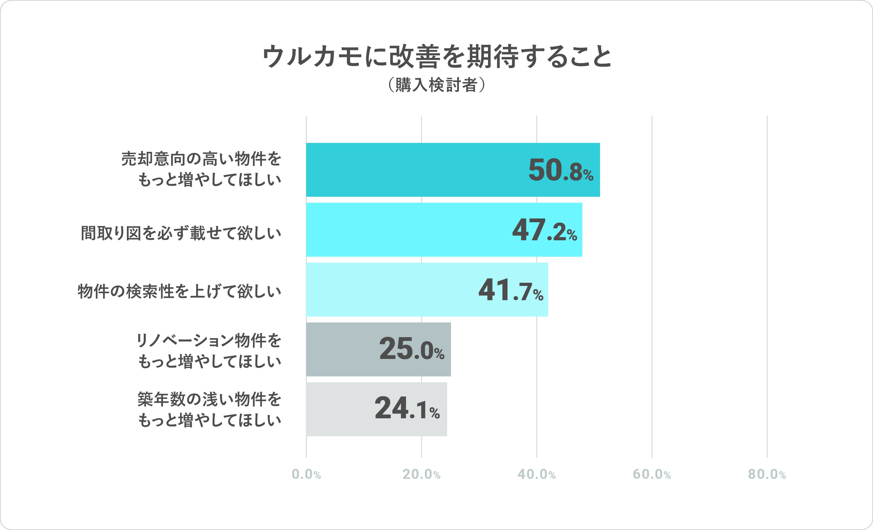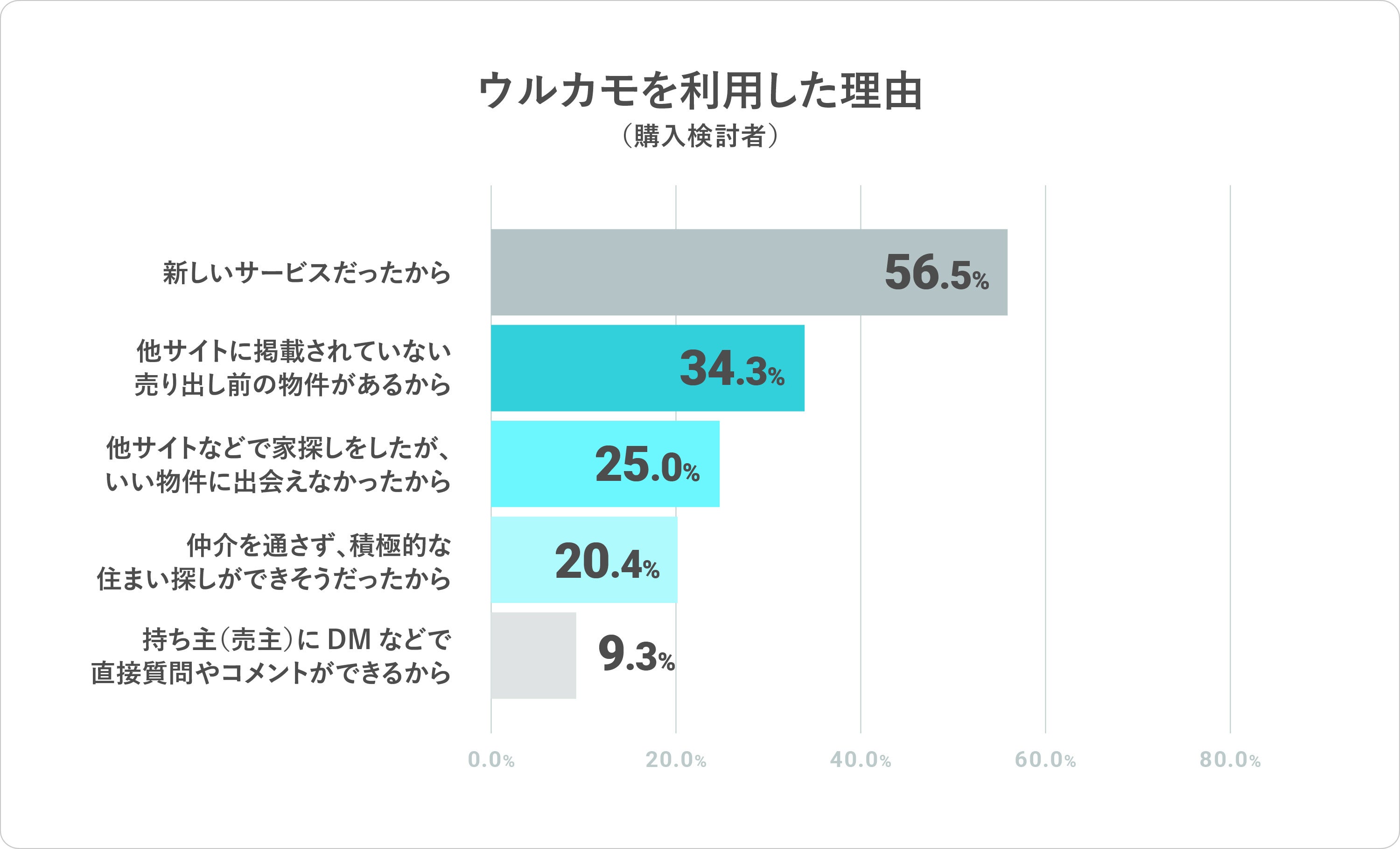 売却検討者と購入検討者が、検討段階からダイレクトにやり取りができ、気軽に、透明性のある不動産の売買の検討を進められるというウルカモの特徴が、売却検討者には「売却に進むかどうかの判断材料を得られる」、購入検討者には「事業者任せではない、より積極的・主体的な住まい探しをする」という行動変化が始まっている可能性を示唆する調査結果でした。