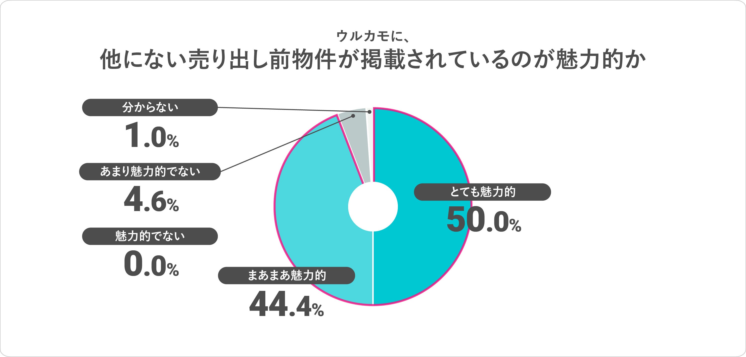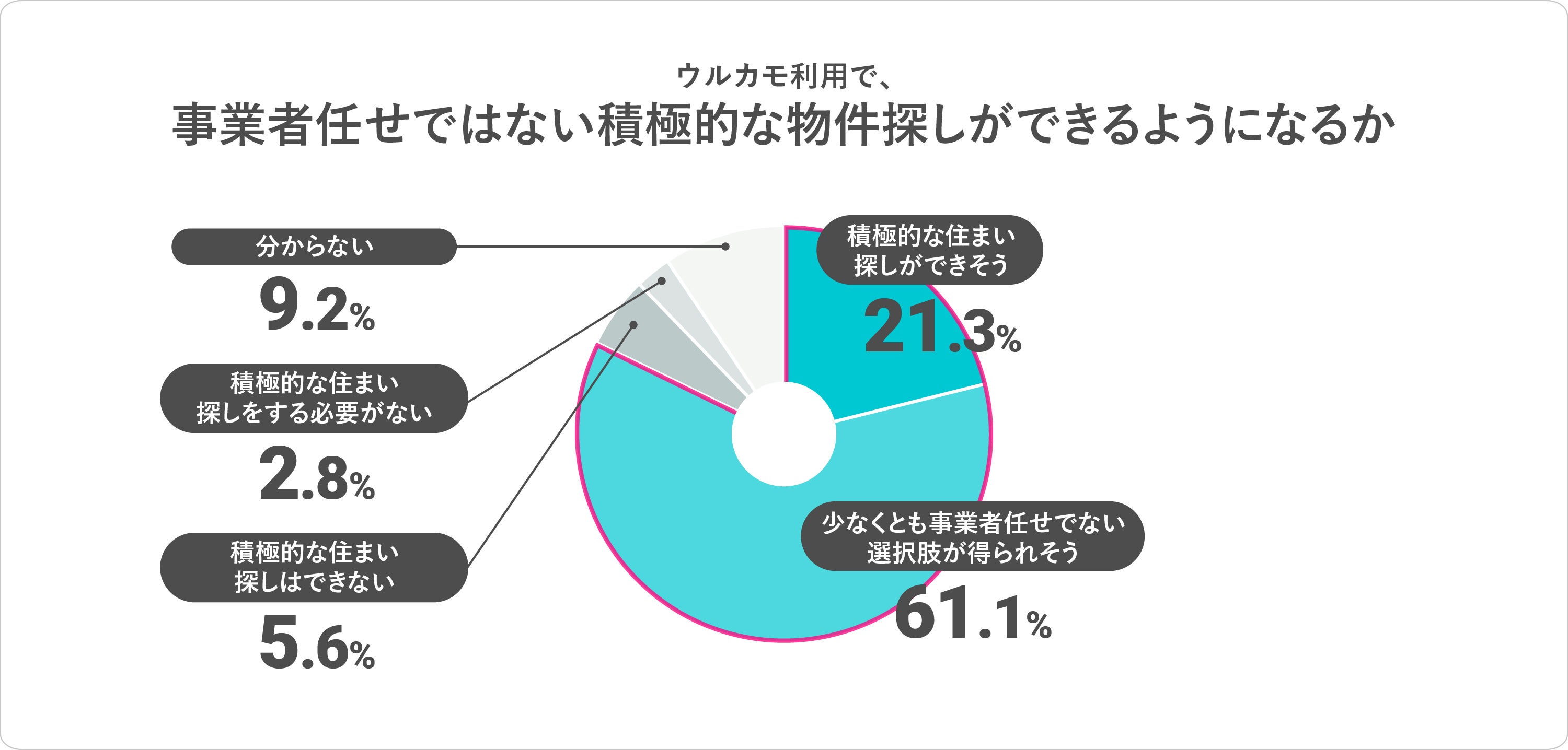 ウルカモを使うことで「不動産営業に物件を紹介してもらうのを待つだけではなく、自分で自分に合う物件を積極的に探すことができるそうか」という問い対し、82.45%が「積極的な住まい探しができそう/少なくとも事業者任せではない、住まい探しの選択肢を手に入れられそう」と、ポジティブな回答をしています。