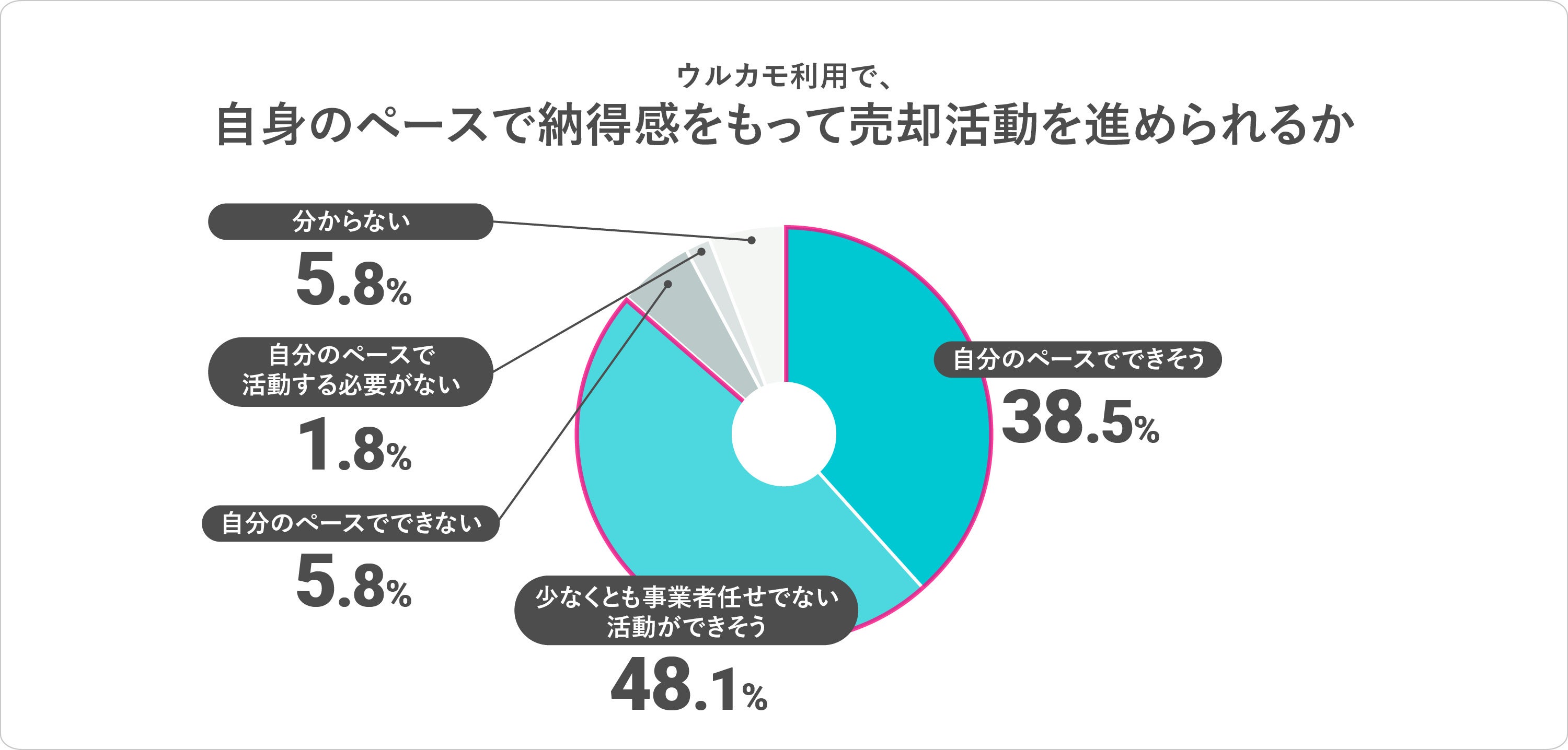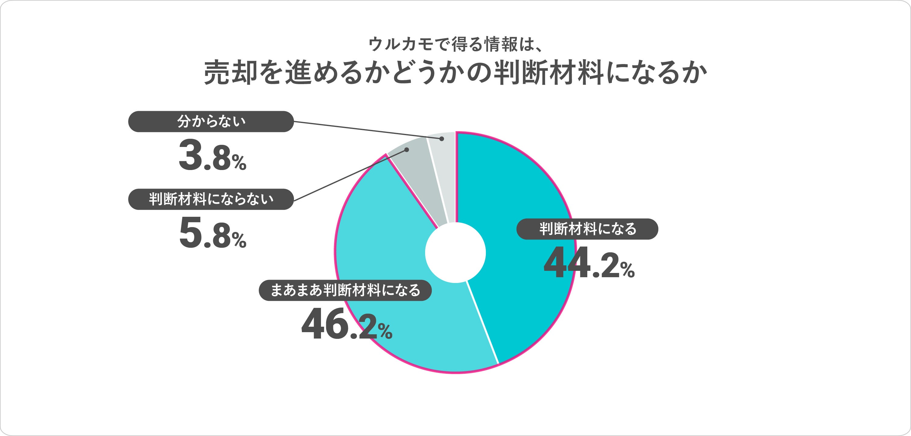 ウルカモを使って「購入検討者からDMやリアクションを受け取ることが売却を進めるかどうかの判断材料になるか」という問いに対し、90.4%が「判断材料になる/まあまあなる」とポジティブな回答をしています。これは、売却検討フェーズから使えて、ダイレクトに購入検討者の反応確認できるウルカモならではの顧客体験といえます。