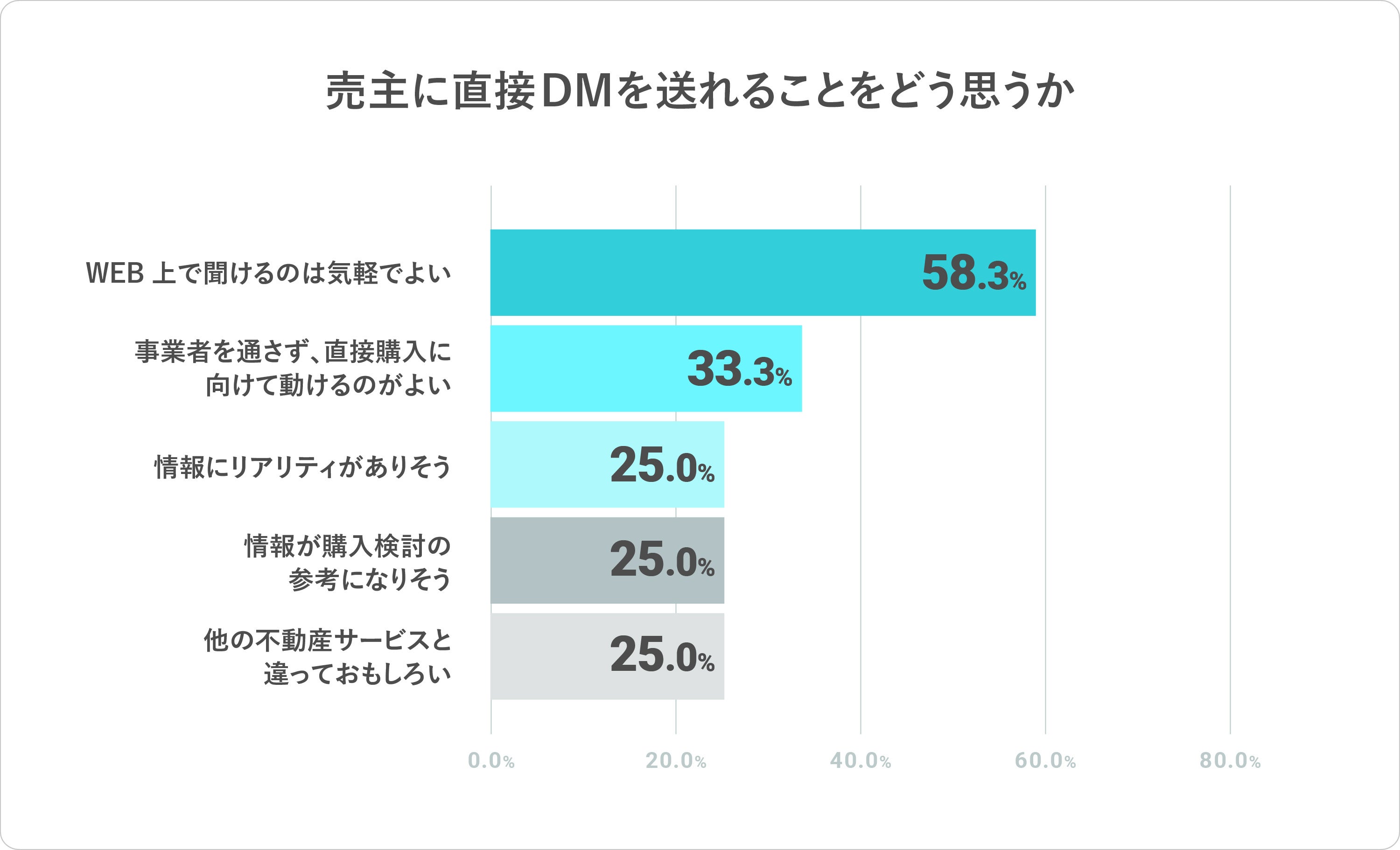 ウルカモで、「事業者を通さず、持ち主(売主)にDMで直接内見希望や物件に関する質問が送れること」について、「WEB上で聞けるのは気軽で良い」「事業者を通さず、直接購入に向けて動けるのがよい」という評価が高くなっています。