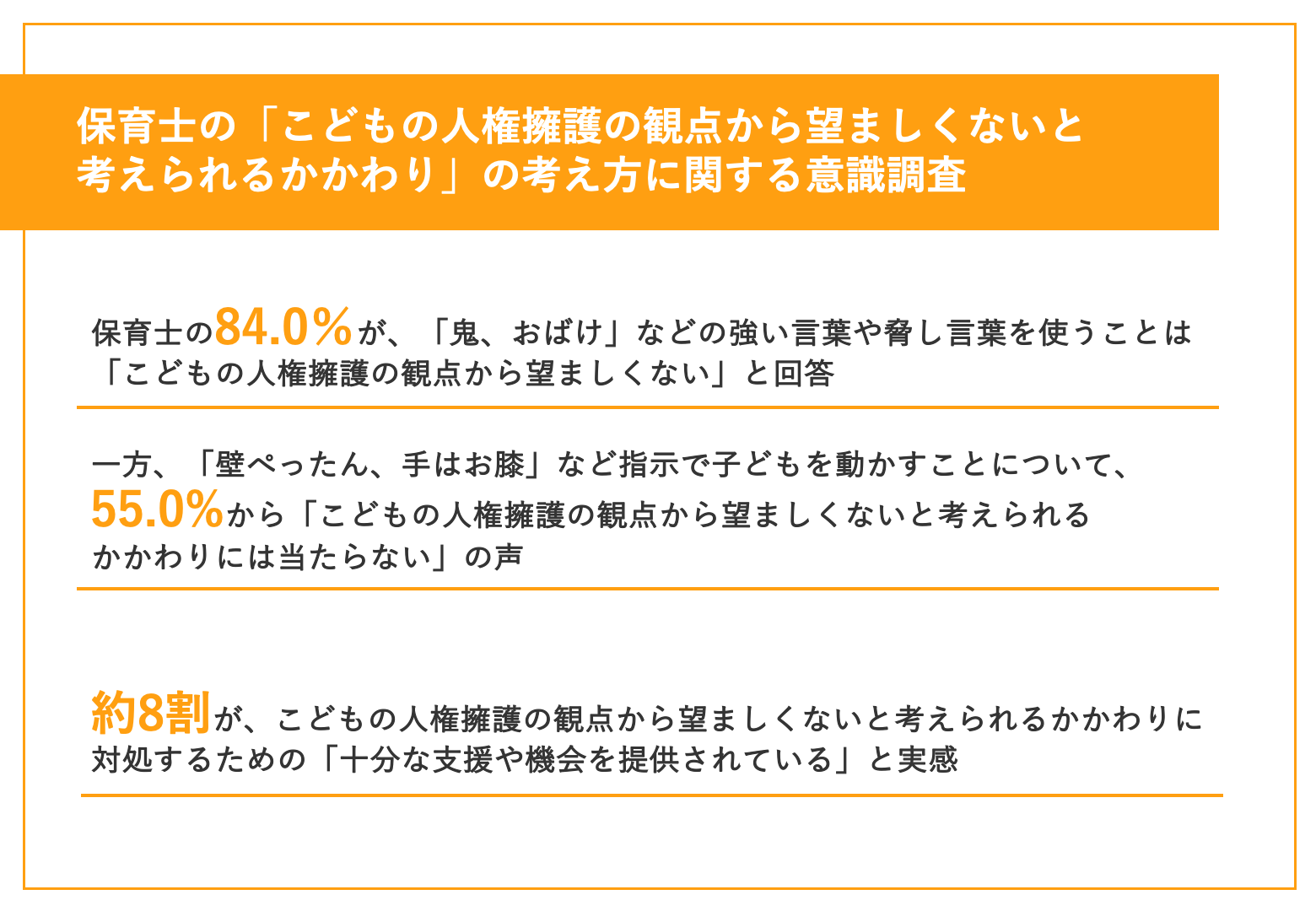 今回は、保育士100名を対象に、保育士の「こどもの人権擁護の観点から望ましくないと考えられるかかわり」の考え方に関する意識調査を実施しました。