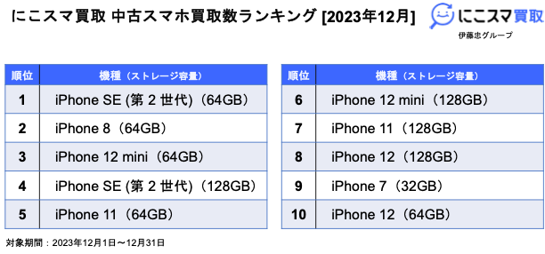 にこスマ|2023年12月中古スマホ販売・買取数ランキング