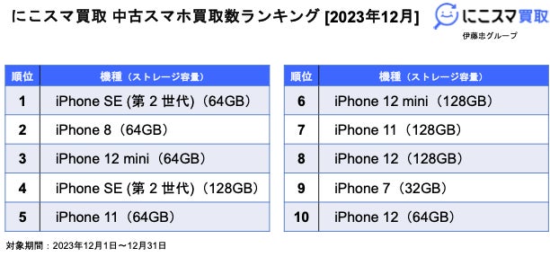 2023年12月の販売数ランキングでは、iPhone SE(第2世代)が3ヶ月ぶりに1位にランクインしました。