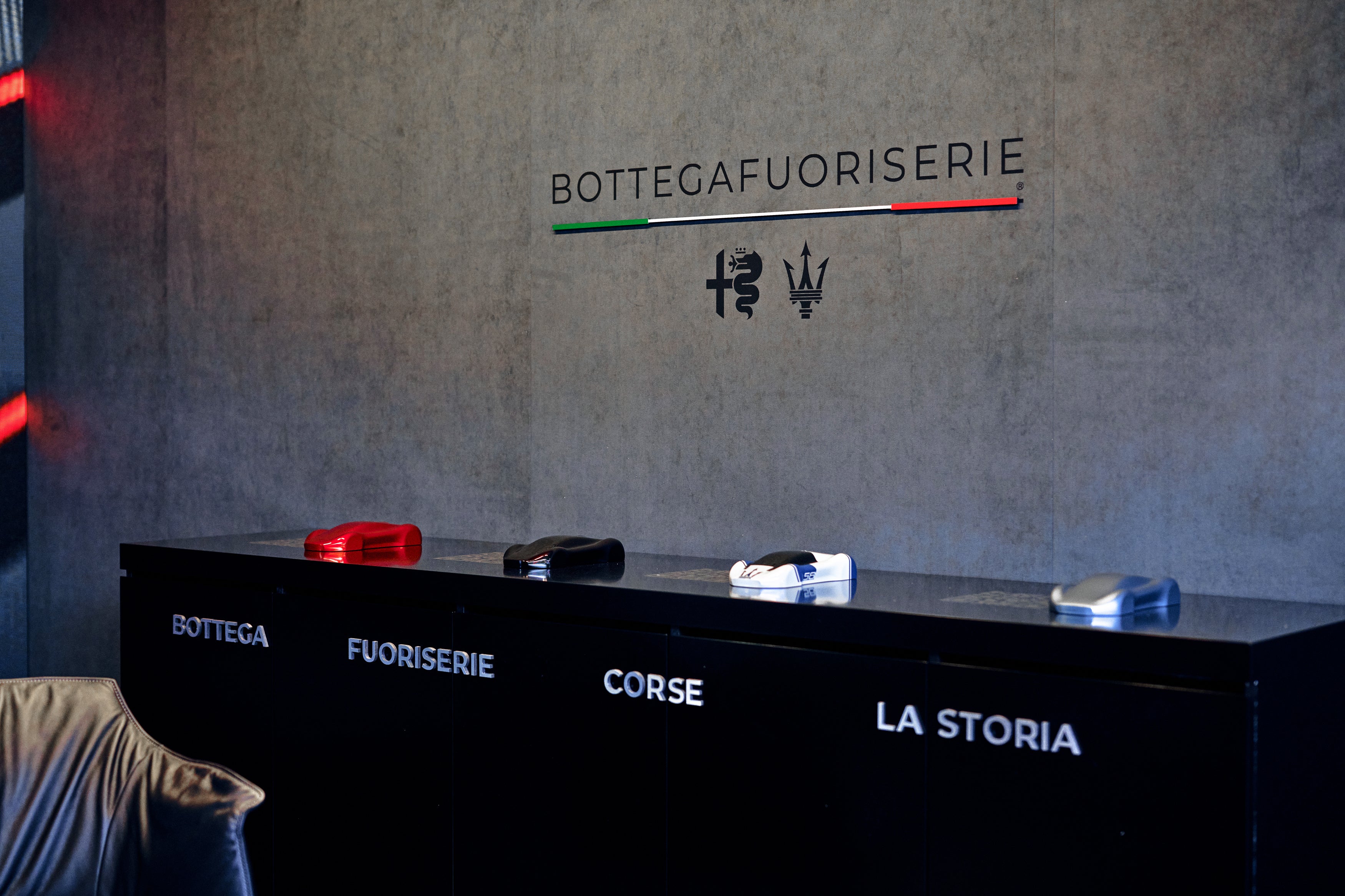 アルファ ロメオの展示エリアにおいて、ALCANTARA®はブランドの世界観を単なる製品展示を超えた没入体験として実感できる空間を提供しました。 ブースの壁面は「アルカンターラ・グレー」で統一。3つのパネルにはALCANTARA®のブランドロゴ、アルファ ロメオを象徴する「ビショーネ(大蛇)」のエンブレム、「BOTTEGAFUORISERIE(ボッテガフオリセリエ)」のレーザー刻印が施されています。