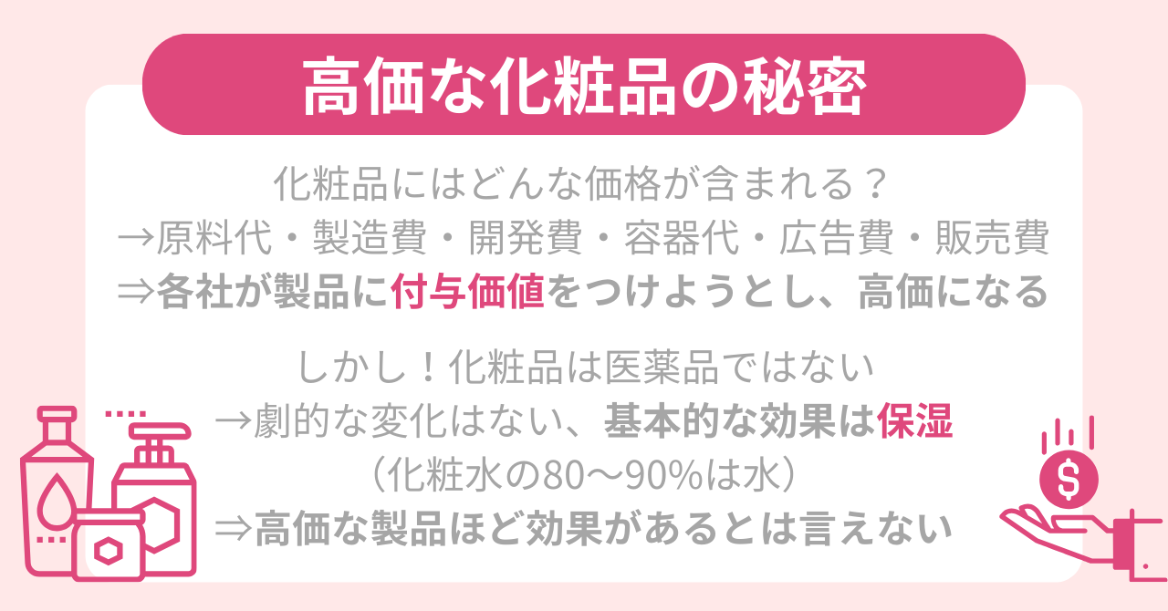 その分、化粧品の価格も向上し、消費者は「高価な製品=効果がある」という認識になりがちです。