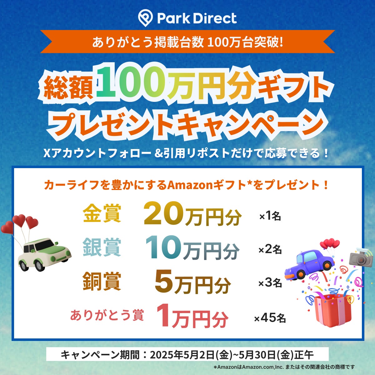 当選者には、6月末日までにパークダイレクトの公式キャンペーンX:パークダイレクト100万台突破記念キャンペーン(@ParkDirect_CP)よりダイレクトメッセージにてAmazonギフトをお送りします。 ※AmazonはAmazon.com, Inc. またはその関連会社の商標です。 |