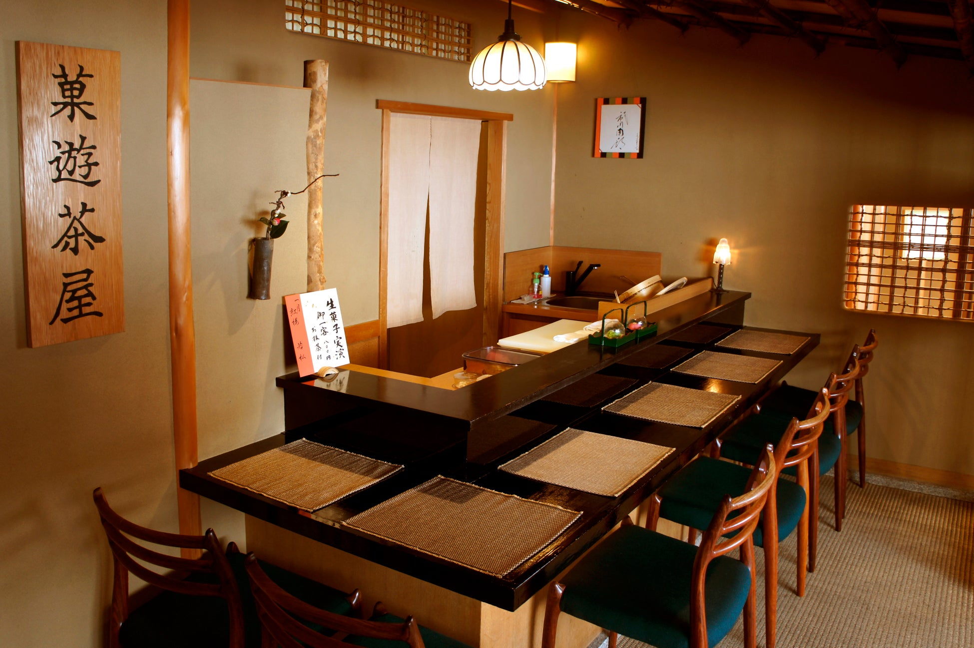 鶴屋吉信 本店2階「菓遊茶屋」は、ご注文いただいた生菓子を和菓子職人がお客様の目の前でおつくりし、出来立てをお召し上がりいただくことのできる実演カウンターです。職人の熟練の技をご覧いただけるほか、職人とのコミュニケーションもお楽しみいただき、和菓子の魅力をより感じていただくためのスペースとして、1992年の開設以来ご愛顧いただいてまいりました。