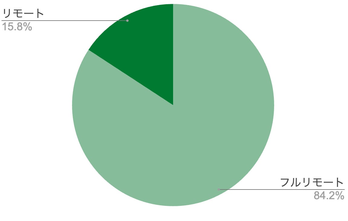 Pythonはリモートワークとの親和性が非常に高い言語です。なんと全体の84%以上の案件がフルリモート(在宅OK)となっており、場所に縛られない働き方が可能です。また、一部リモート可の案件も16%程度あるため、ほぼすべてのPython案件でリモートワークが選択できる状況にあります。この結果から、Pythonの開発者はオフィス勤務に縛られることなく、自由度の高い働き方ができる環境にあるといえるでしょう。Pythonのリモートワーク対応の高さは、開発者にとって大きな魅力の1つと言えます。