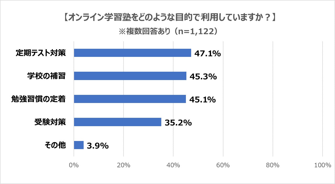 また、オンライン学習塾を利用する目的として最も多く挙げられたのが「定期テスト対策」と「学校の補習」であることから、受験前の短期的な利用よりも、定期テストや勉強習慣など日常的な学力の向上を目指すことを目的に利用するケースが多い傾向にあることがわかりました。
