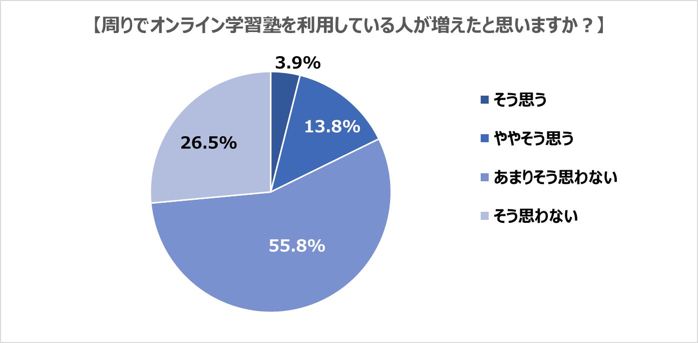 オンライン学習塾の利用者を対象に、周囲の利用状況に関する意識調査を行ったところ、オンライン学習塾を利用している人が「周囲で増えている」と感じた割合は17.7%と限定的でした。この結果は、オンライン学習塾の利便性や効果が実際の利用者以外に十分伝わっていないという点の他に、地方や一部地域ではオンライン学習塾というサービス自体の認知がまだ広がりを見せていない状況が伺えます。