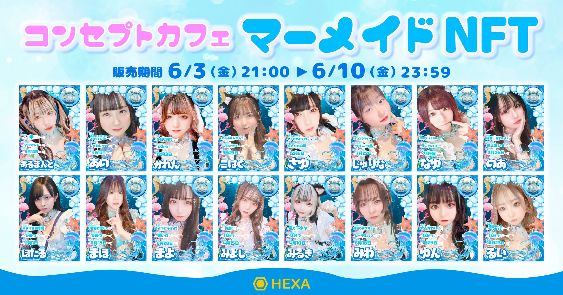 NFTマーケット「HEXA(ヘキサ)」では、株式会社デュアリス・エイチグループ株式会社と共同で秋葉原のコンセプトカフェ「Mermaid」のメイドさんのNFTを販売します! 6/3(金)より先着販売でメイドさん1名につき1枚限定の先着販売となります。