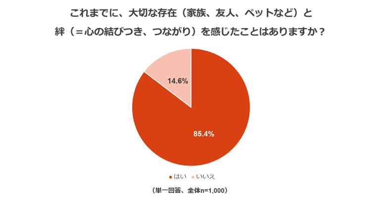 最後に、大切な存在(家族、友人、ペットなど)との絆(つながり)を感じることは、自身にとって幸せなことかを尋ねたところ、98.8%が「自身にとって幸せなこと」だと回答しました。これは、ほぼ全ての方が「大切な存在との絆」を「幸せ」だと捉えているとも言えるのではないでしょうか。