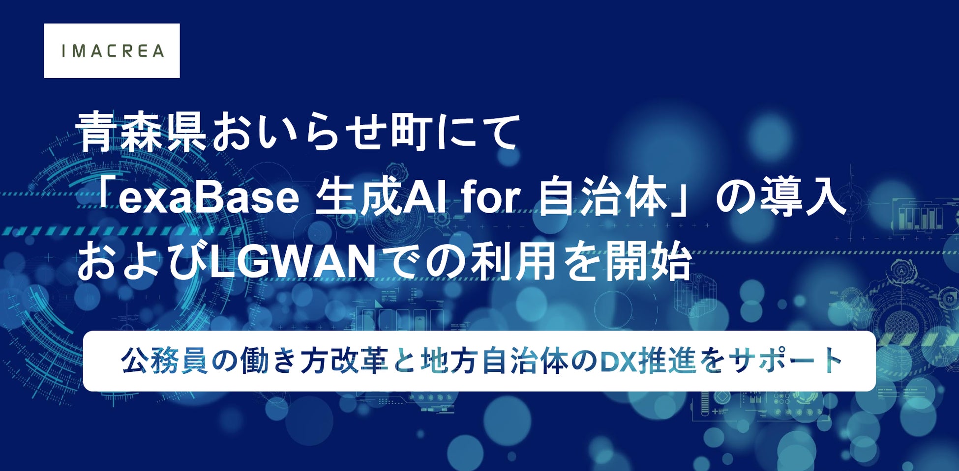 株式会社イマクリエ(本社:東京都港区、代表取締役:鈴⽊信吾、以下、当社)は、青森県おいらせ町に「exaBase 生成AI for 自治体」を導入したことをお知らせします。