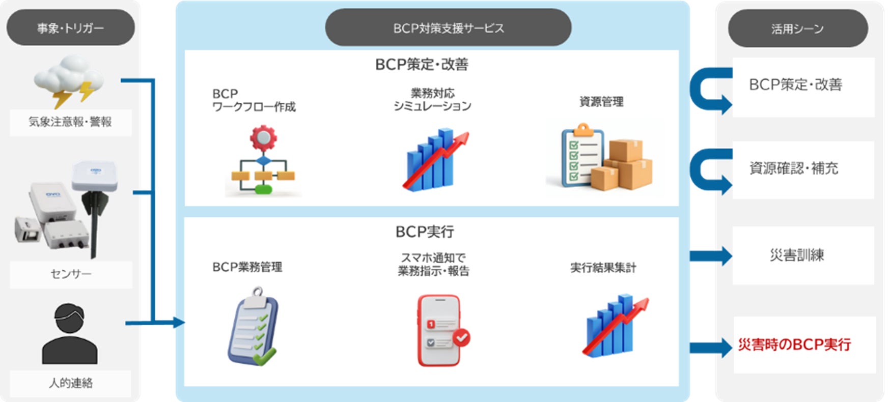 「BCP対策支援サービス」は、当社システムや外部システムと連携することでBCP発令のトリガーとなる事象を検知し、その検知情報をもとに、システムに事前に登録したBCPを自動的に発動させ、迅速な災害対応行動を支援するシステムです。訓練モードや資源管理機能も搭載しており、平時から事業継続の有効性を確認することが可能です。