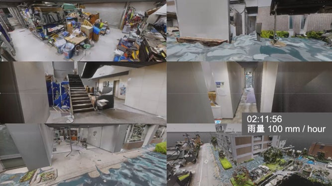 「浸水被害予測サービス」は、デジタルツイン技術を用いて、都市の広域から狭域のシミュレーションまで段階的に行うことができます。狭域シミュレーションでは、建物単位で浸水状況の時間的な変化など、従来よりも複雑な条件を設定でき、止水板や排水ポンプの設置によるリードタイムの変化をシミュレーションすることも可能です。