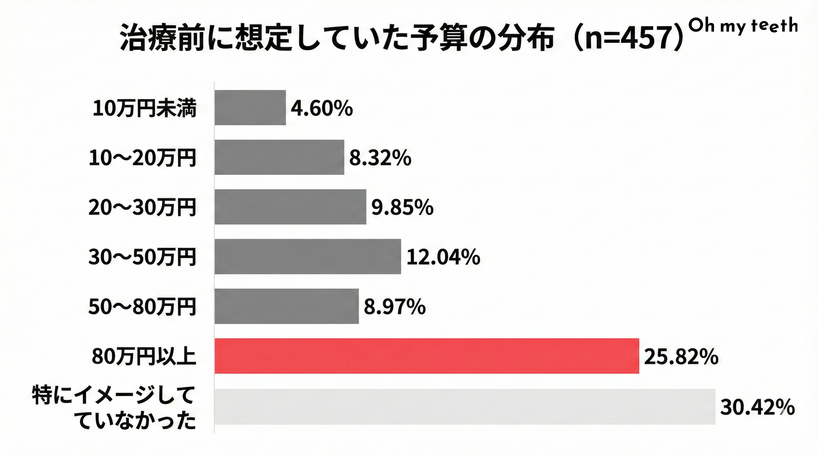 治療前に想定していた予算について質問したところ、最も多かったのは「80万円以上(25.8%)」でした。 矯正治療には「高額」というイメージが定着している一方、「特にイメージしていなかった(30.4%)」という回答も多く見られました。