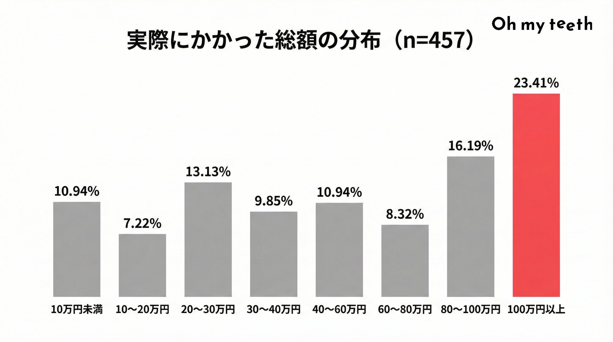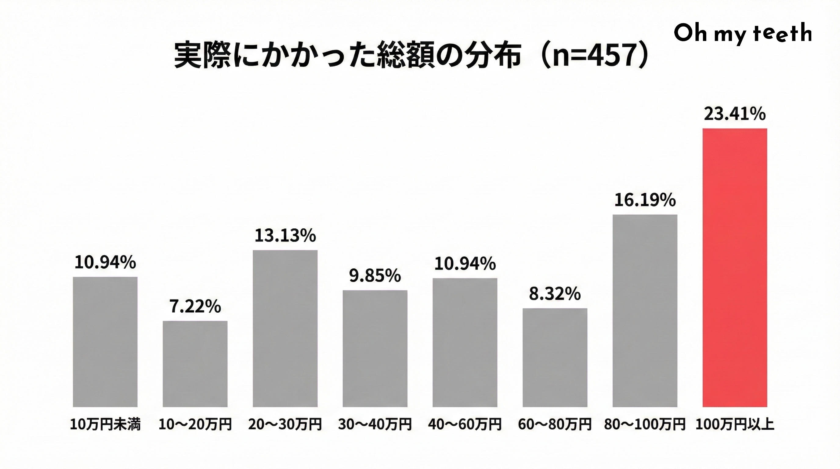 実際に支払った総額を見ると、「100万円以上」が23.4%で最多となり、全体矯正などの本格的な治療には依然として相応の費用がかかることが分かります。