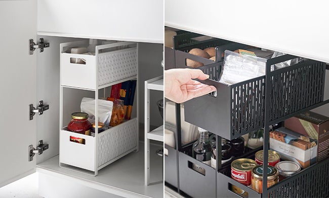 シンク下に設置できる2段のバスケットや、スポンジと洗剤をまとめておくことができるラックなど、新商品発売。