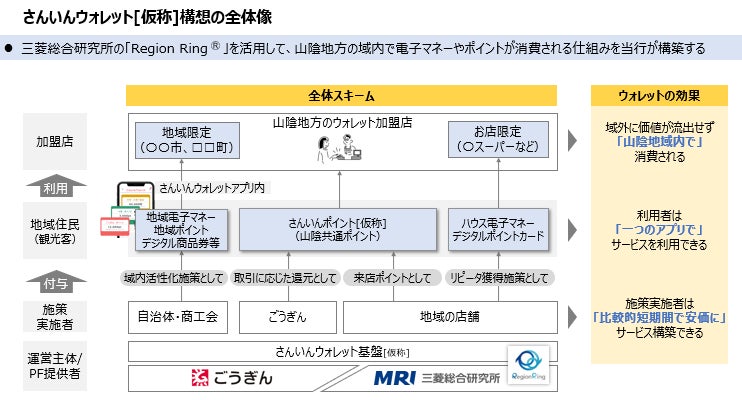 MRIとごうぎんは、地域内で利用可能なポイントや地域通貨を発行・管理する「さんいんウォレット基盤(仮称)」の構築を目指します。これを自治体や事業者が利用できるようにすることで、地域内の行政施策の円滑な実現や経済取引の活性化を可能にします。将来的に山陰地域内で共通で使えるポイントや地域通貨の提供、地元のスーパーやホームセンターといった事業者が、従来よりも短期間かつ安価にハウスポイントやハウス電子マネー(※1)を発行できる仕組みを提供する事業等の共同実施に向け、検討・実装します。