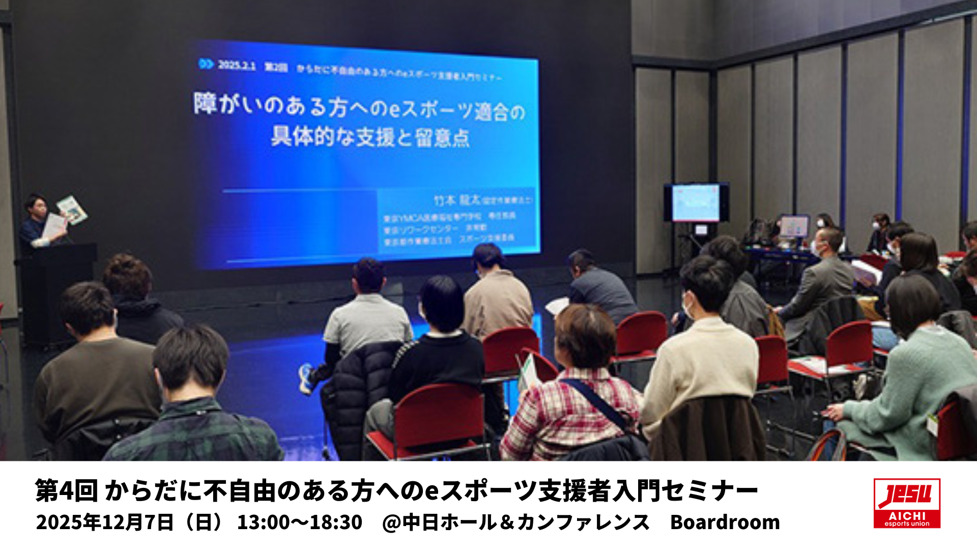 一般社団法人日本 e スポーツ協会(会長:早川英樹 以下、JESU)は、12月7日(日)に、障がいを持つ方のeスポーツ参加を支援する人材の育成を目的としたセミナーを開催することをお知らせします。あわせて、セミナー参加者の募集を開始することもお知らせします。