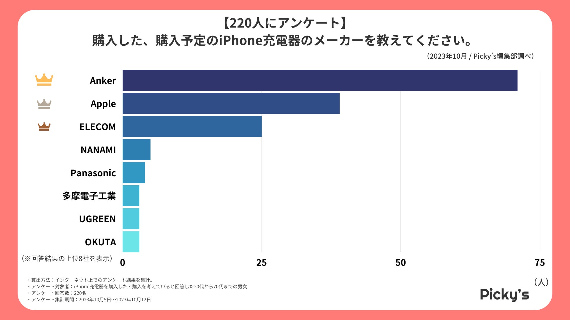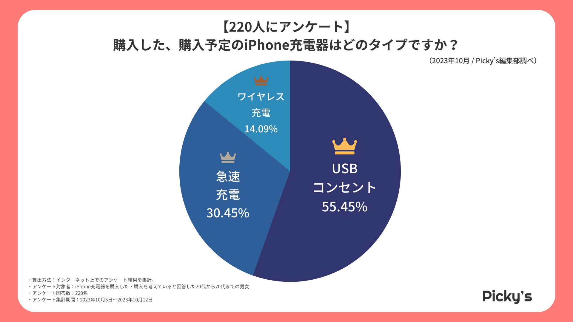 「Picky’s」は、インターネットショッピングにおいて、購入前に試せない・選ぶべきものがわからないという課題の解決を目標に、あらゆる商品のおすすめランキングや検証レビューを紹介するサイトです。このたびPicky’s(https://rentry.jp/note/)では、iPhone充電器についてインターネット上でアンケート調査を行いましたので発表いたします。