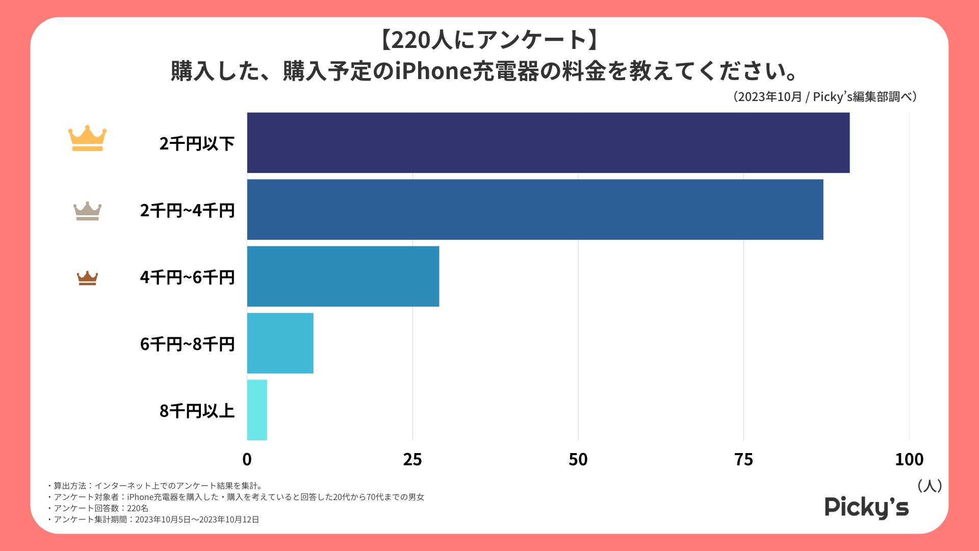 先ほどの選ぶポイントのアンケートで1番多かった回答「価格」。アンケート調査の結果、選択肢で価格が安い順で回答が多くなる結果となりました。特に「2千円以下」と「2千円~4千円」がダントツで回答数が多く、iPhone充電器を購入されるときは、低価格帯がとても好まれることが推測できます。