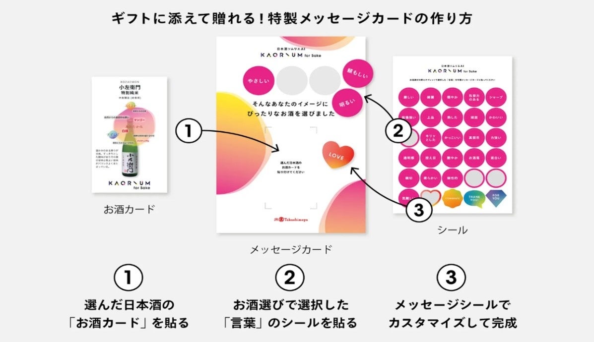 特製メッセージカードは、選んだ日本酒の風味がわかる「酒カード」と、「やさしい」「頼もしい」などの、お酒選びで選択した「言葉」のシールをメッセージカードに貼り付け、最後に「Thank you」などのメーセージシールでカスタマイズして作成することができます。