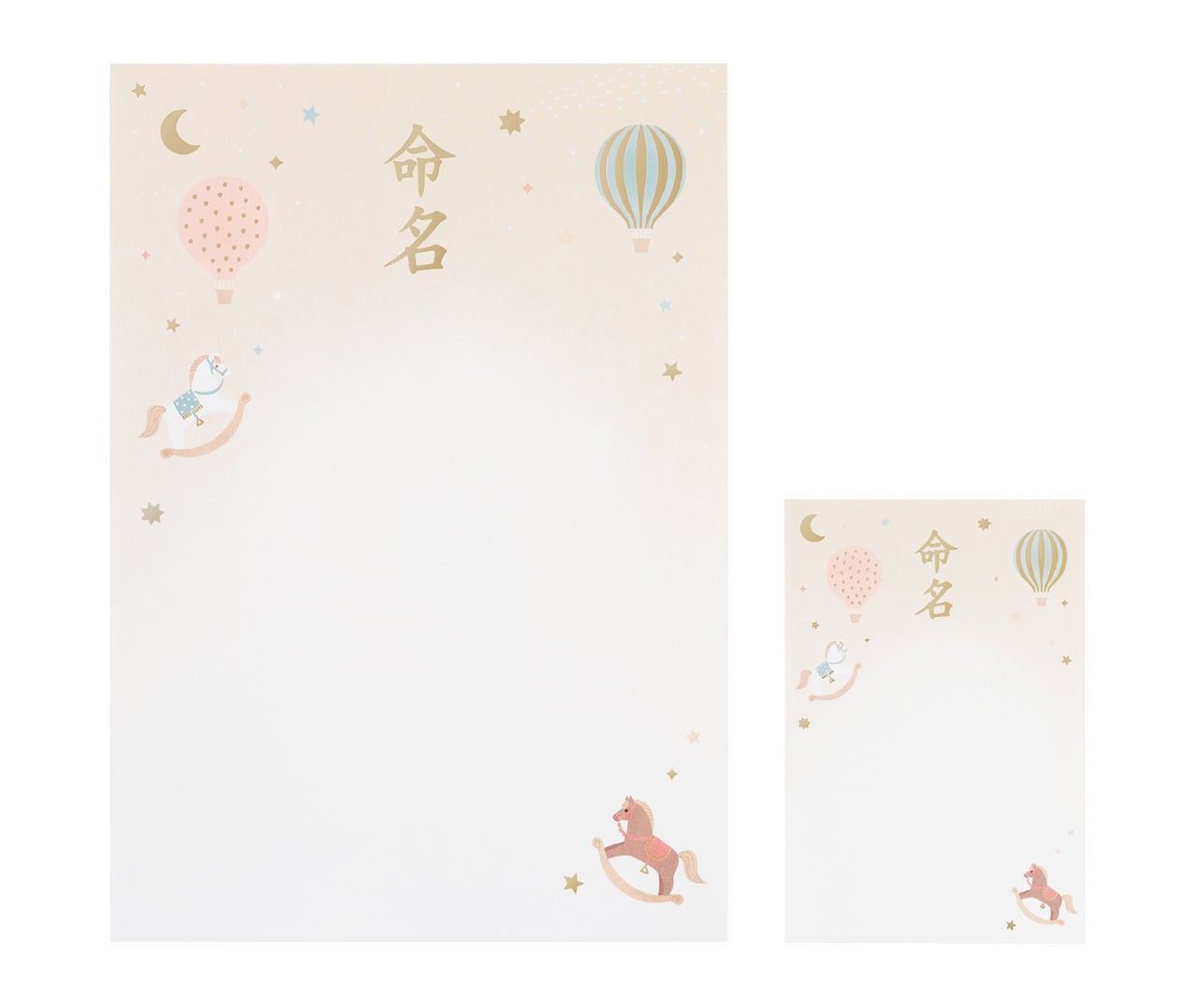 ベージュ色を基調とした性別を問わず使えるデザインで、木馬や気球のモチーフがやさしい雰囲気を添えています。箔押しの輝きが命名の瞬間をより華やかに引き立てます。