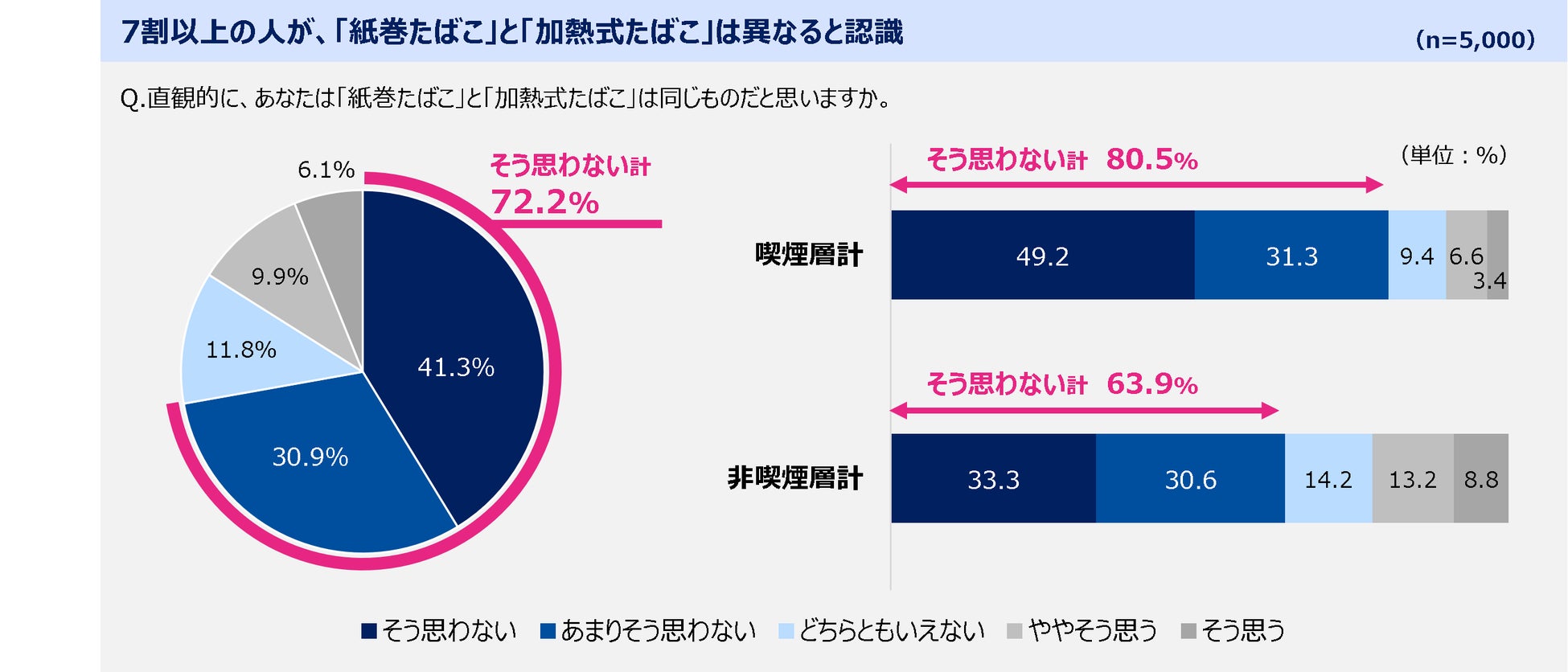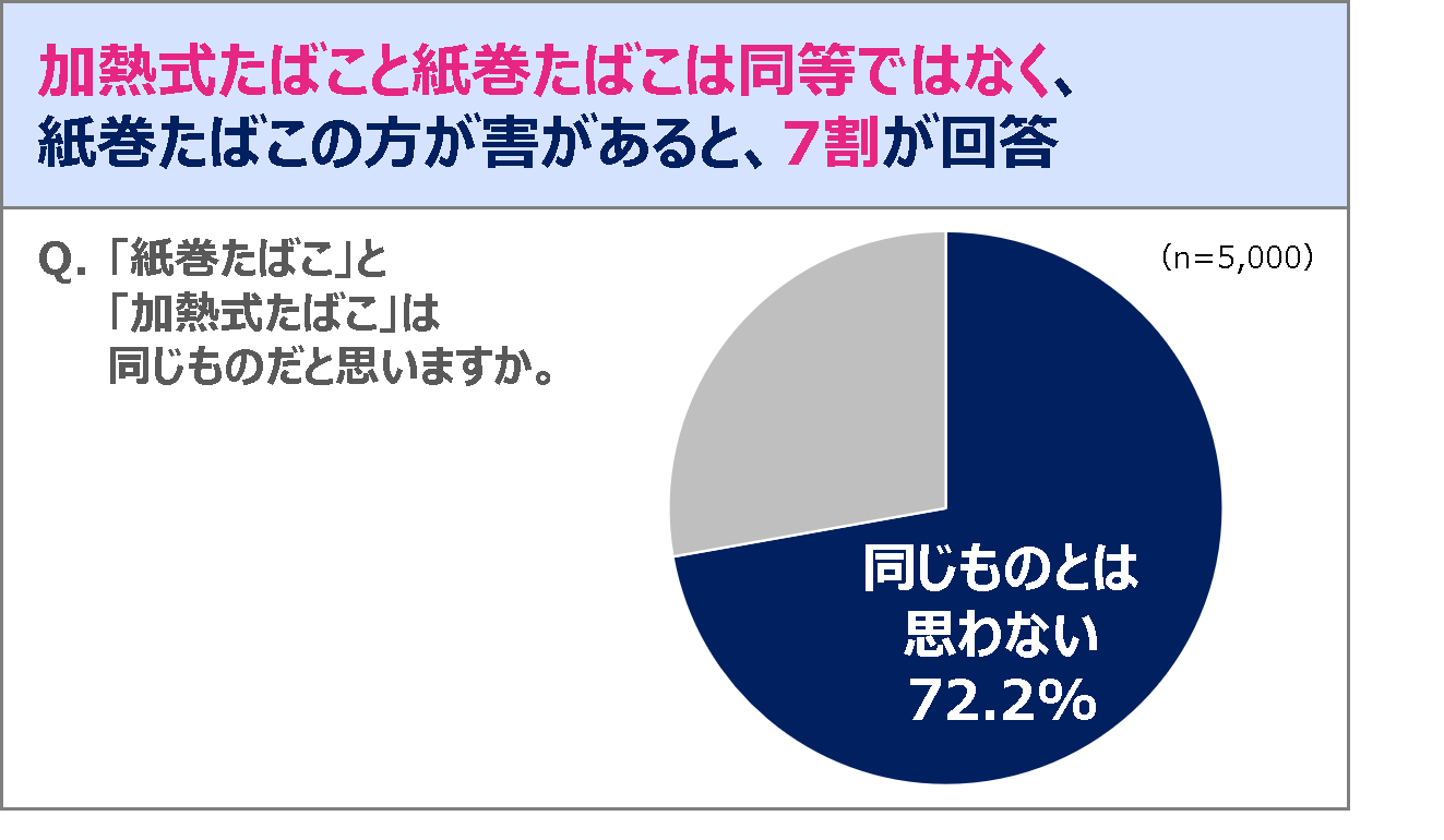 現在、政府・与党は、「加熱式たばこ」と「紙巻たばこ」を同等とし、「加熱式たばこ」を「紙巻たばこ」と同水準の税率に引き上げることを検討しています。しかし、調査対象者全員に、「紙巻たばこ」と「加熱式たばこ」が同じものであるかを尋ねたところ、7割以上(72.2%)の人が、「そう思わない」と回答しており、多くの人が、「紙巻たばこ」と「加熱式たばこ」は異なるたばこと認識していることが明らかになりました。