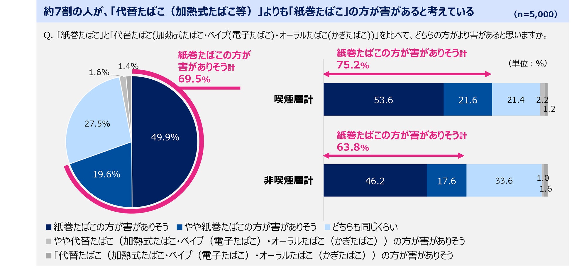加熱式たばこと紙巻たばこは同等ではなく、紙巻たばこの方が害があると、7割が回答