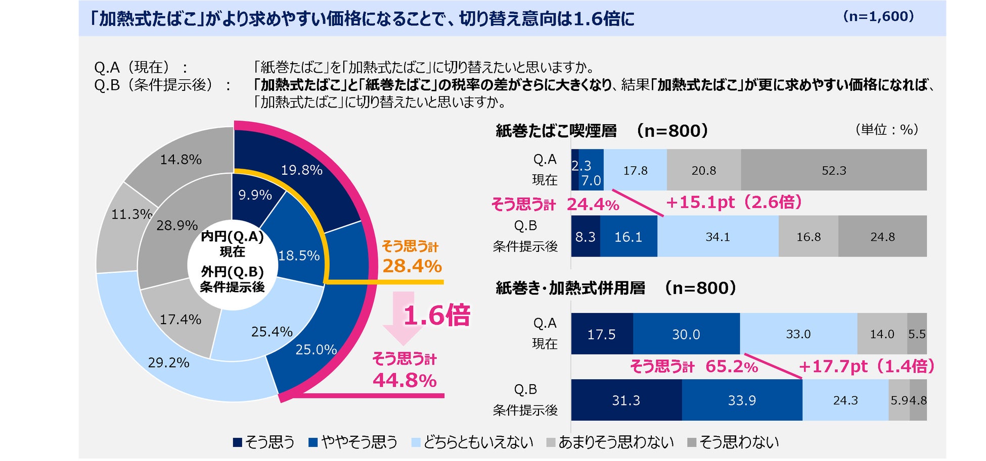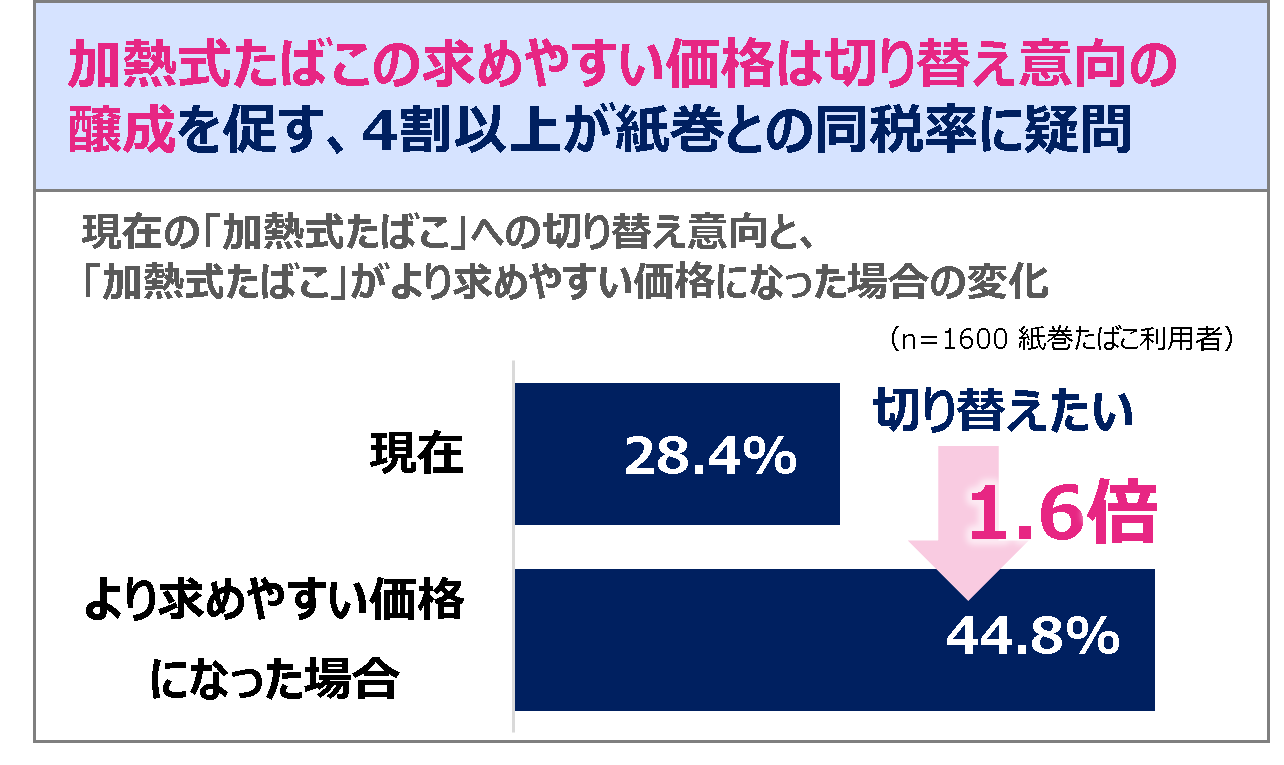 その結果、「加熱式たばこ」が求めやすい価格になることで、完全に切り替える意向が1.6倍に高まることが明らかになりました。