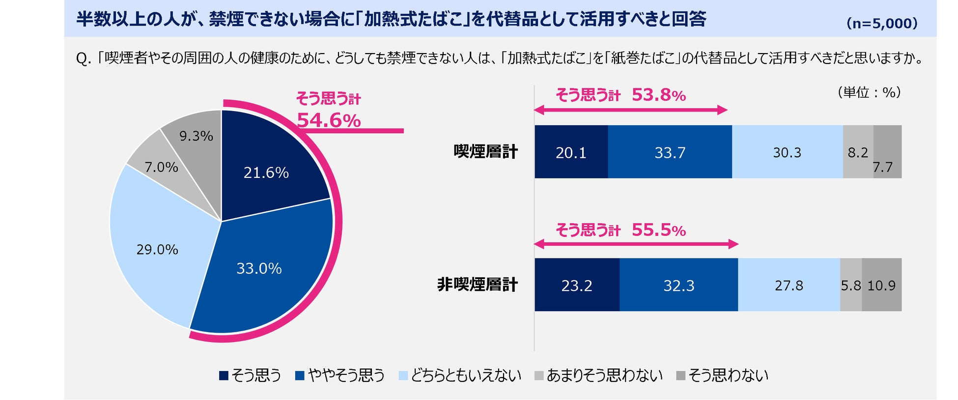 調査対象者全員に、喫煙者やその周囲の人の健康のために、どうしても禁煙できない人は、「加熱式たばこ」を「紙巻たばこ」の代替品として活用すべきと思うかを尋ねたところ、半数以上(54.6%)の人が「そう思う」と回答しました。