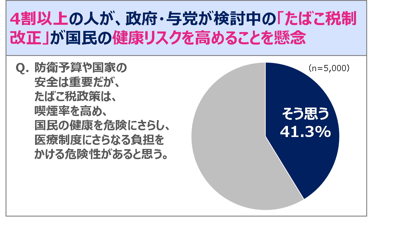 本調査の結果は、「紙巻たばこ」と「加熱式たばこ」の税率差が広がり、「加熱式たばこ」が求めやすい価格になることで、「紙巻たばこ」から「加熱式たばこ」への切り替え意向が1.6倍も高まることを示しています。現在、政府・与党は「加熱式たばこ」と「紙巻たばこ」を同等とみなし、防衛力強化の財源確保のための手段のひとつとして、「加熱式たばこ」を「紙巻たばこ」と同水準の税率に引き上げ、そのうえで両方の税額をさらに引き上げる計画であると発表しています。一方で本調査結果では、4割以上の人が予定通りにこの「たばこ税政改正」が実行されると、「紙巻たばこ」の喫煙率が高まり、国民の健康リスクが上昇して医療費増につながると、懸念を抱いていることが明らかになりました。