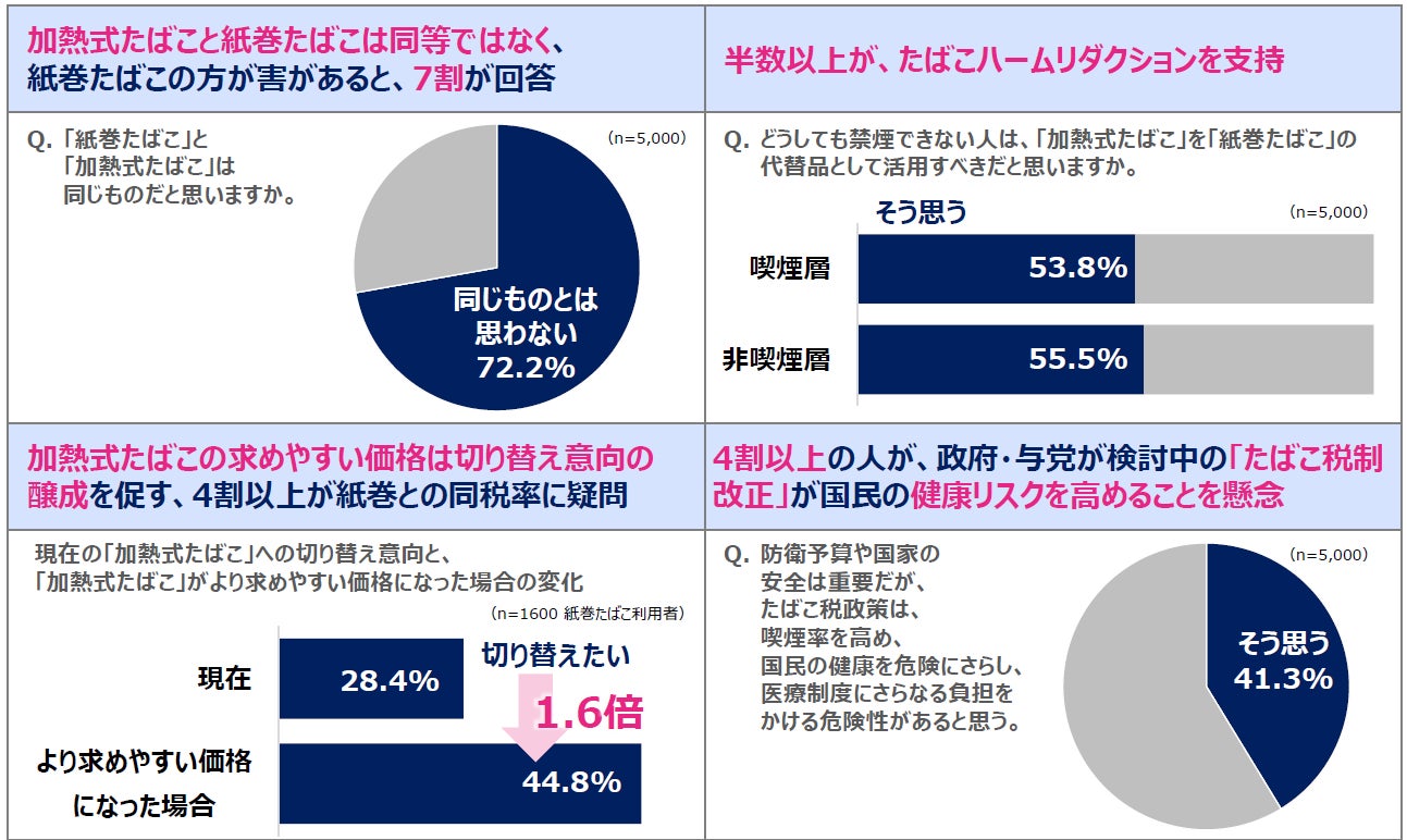 このように調査結果は、「紙巻たばこ」を喫煙し続けることを選択した人にとって、「加熱式たばこ」は健康リスク低減の可能性を秘めた代替品となりうる、と多くの人が考えており、たばこハームリダクションの概念が日本社会で徐々に受け入れられていることを示しています。