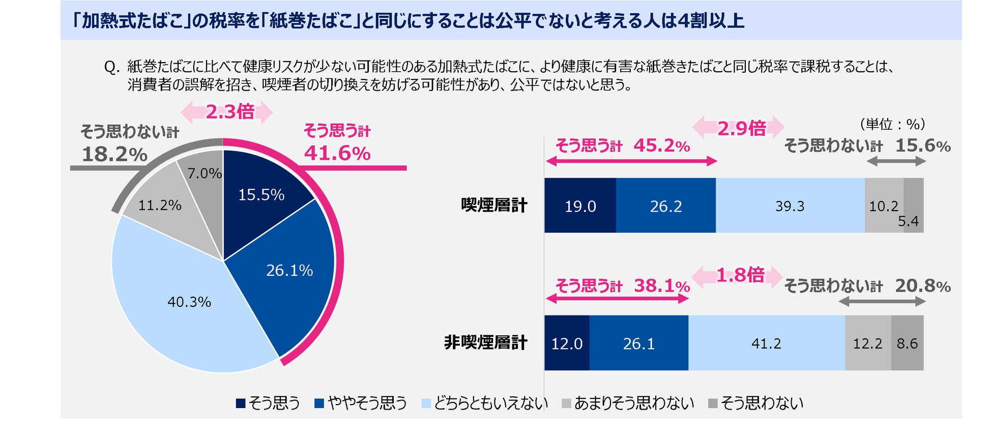 さらに、回答者全員に対し、「加熱式たばこ」の税率を引き上げて「紙巻たばこ」と同税率にすることは公平でないと思うかと尋ねたところ、4割以上(41.6%)の人が「そう思う」と回答し、「そう思わない」 とした人の割合(18.2%)に対し2.3倍となりました。また、非喫煙層でも「そう思う」と回答した割合は約4割(38.1%)となり、「そう思わない」の回答割合と1.8倍の差が開きました。
