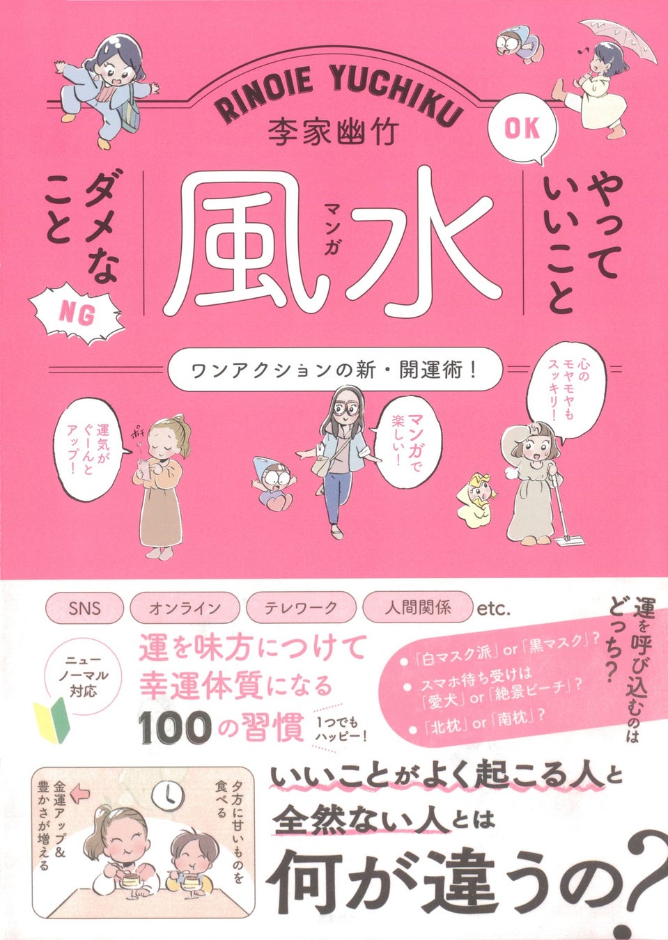 本書は、著者累計700万部を超える人気No.1風水師の李家幽竹先生に教わる新しい生活様式に対応した開運術の本。「白マスクと黒マスク、運を呼び込むのはどっち?」「仕事運が上がるZOOMのバーチャル背景は?」「スマホのキャッシュレス決済アプリ、何個までなら金運がアップしやすくなるの?」など身近な質問に答えたプチ開運方法をマンガでわかりやすく解説しています。